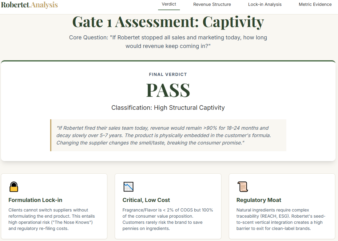 Fail :revenue depends on constant selling effort. The bucket leaks. Stop here. No need to run Gate 2 or Gate 3.