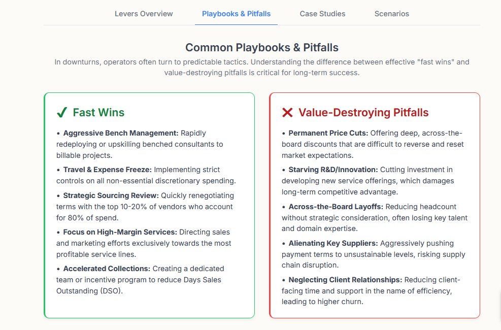 Pitfalls : quick fixes that cause damage: cutting prices too deep, starving R&D, delaying maintenance.