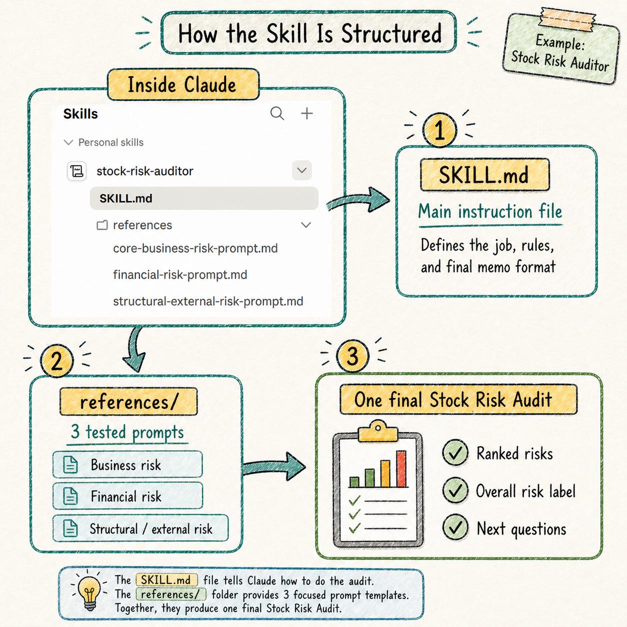 Result: a 7–8 page Stock Risk Audit, structured the way I designed it inside the skill.