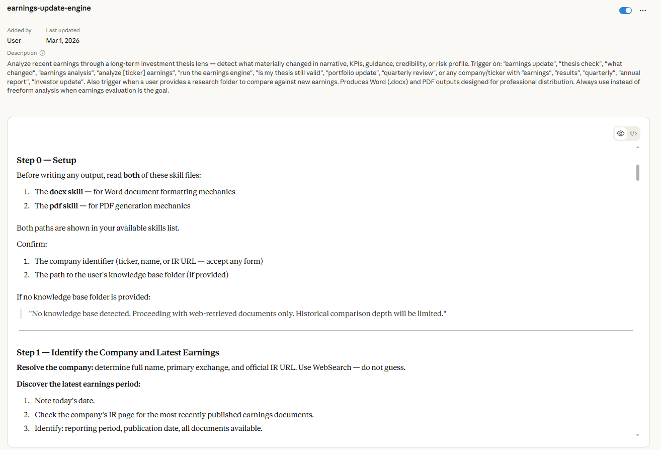 Inside it are structured instructions that tell Claude exactly how to analyze earnings from an investor’s perspective.