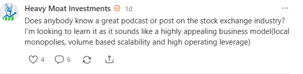 Many thanks for this, very useful. I see exchanges as good opportunities to invest into some emerging markets or regions outside of the main stream. The business is often really sticky and usually the companies return lots of capital back to shareholders. Makes for a good IRR if bought right, with limited risks due to the local monopoly dynamics that often happen.