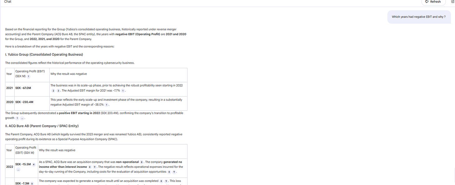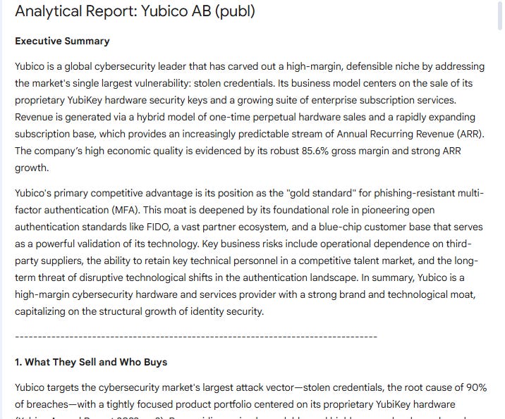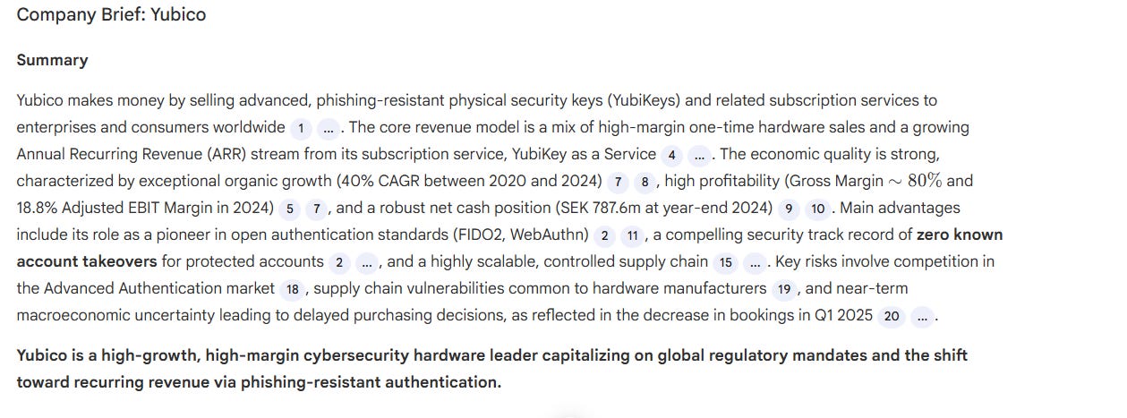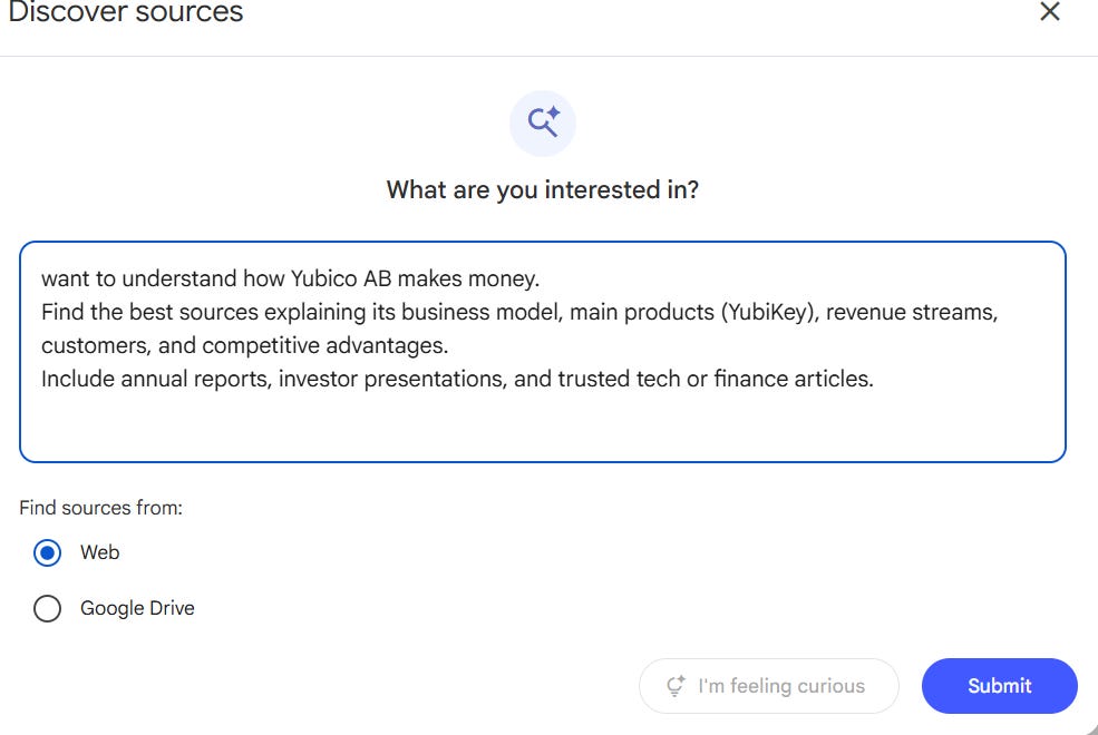 Open NotebookLM → click New Notebook → name it after the company (ex: Yubico AB It’s an interesting Swedish ex-darling in cybersecurity, known for its physical authentication keys).