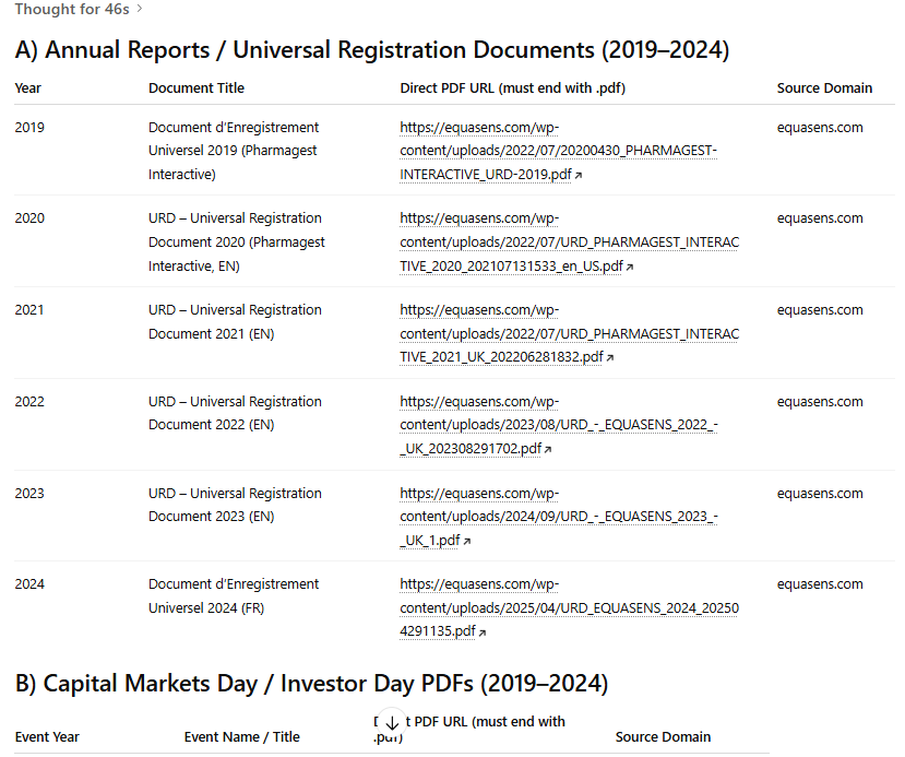Grab official PDFs with the retrieval prompt. Annual reports and Investor Day.Summarize, Listen or watch